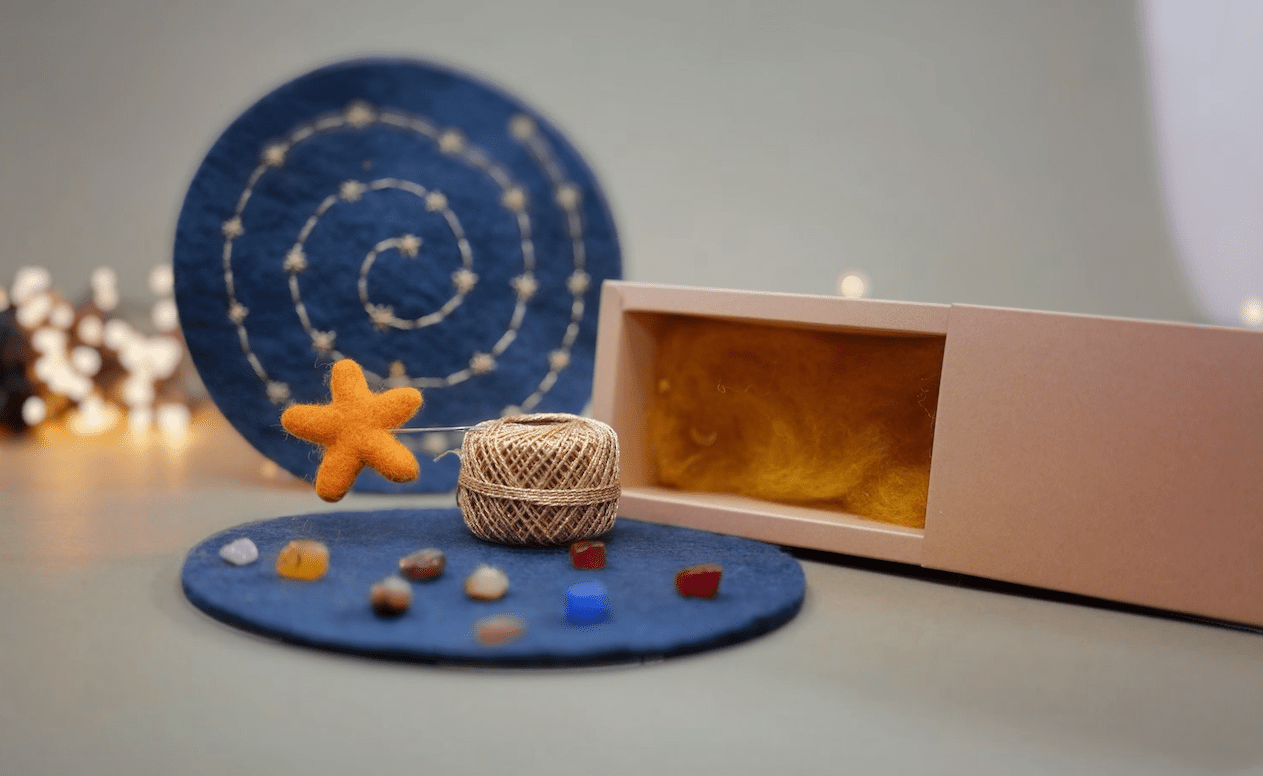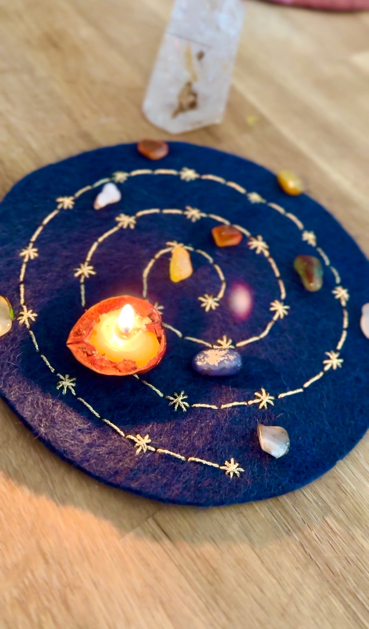 Aus der runden Filzplatte entsteht mit goldenem Garn eine leuchtende Spirale, die das Licht symbolisch in die Dunkelheit trägt. In ihrer Mitte findet das Teelicht seinen Platz. Es darf entzündet werden, um den Beginn des Advents zu feiern.