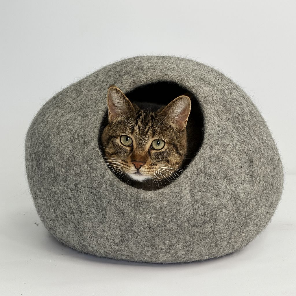 Unsere Katzenhöhlen sind aus 100% Merinowolle. Der natürliche Geruch sorgt für Wohlbehagen und die Wolle reguliert die Feuchtgkeit in der Höhle ganz natürlich