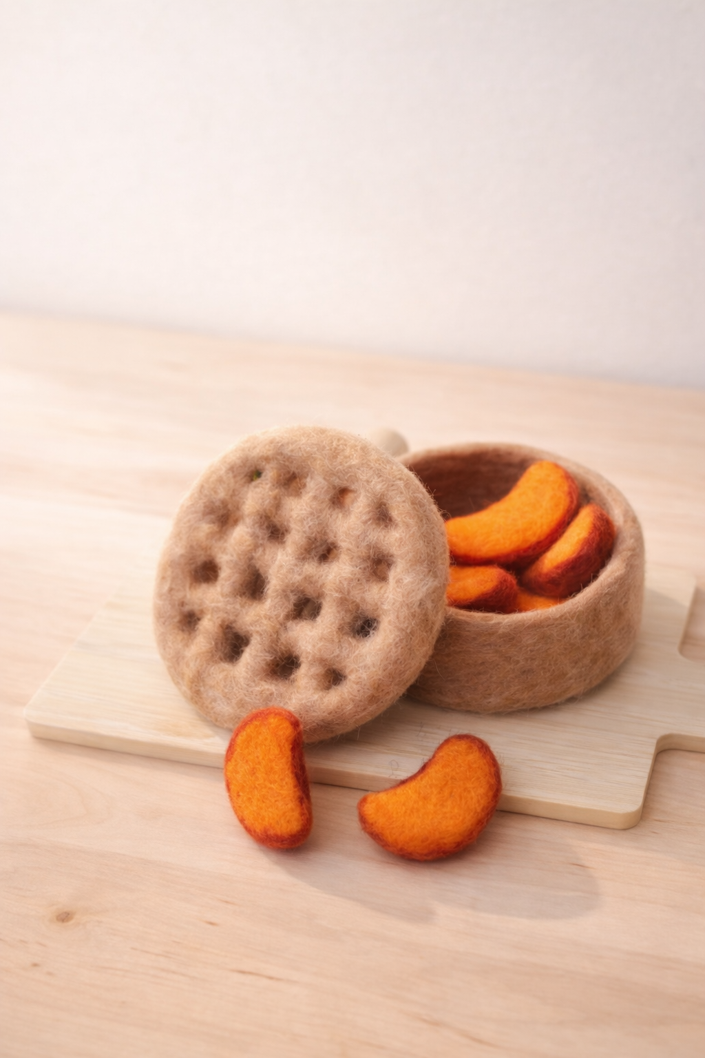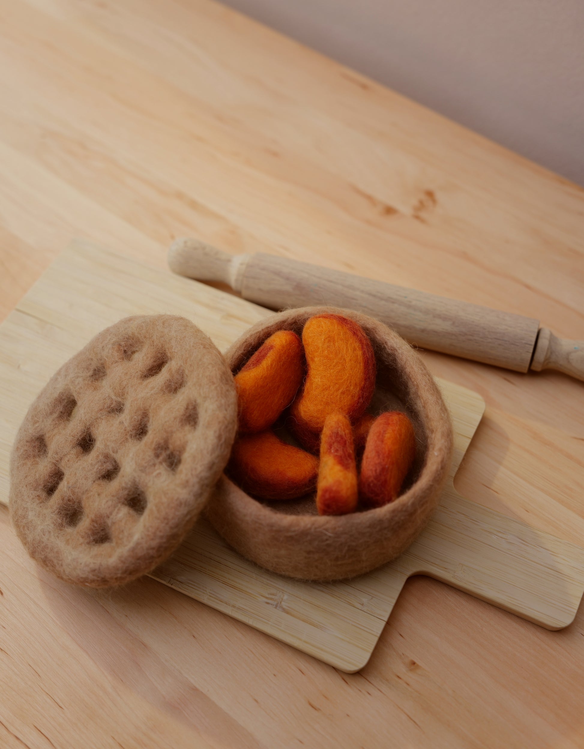Dieser liebevoll handgefilzte Pfirsichkuchen aus Filz lädt Kinder zum fantasievollen Spielen ein. Unter der weichen Gitterkruste verbergen sich sechs herausnehmbare Pfirsichstücke, die zum Zählen, Sortieren und gemeinsamen „Backen“ einladen.
